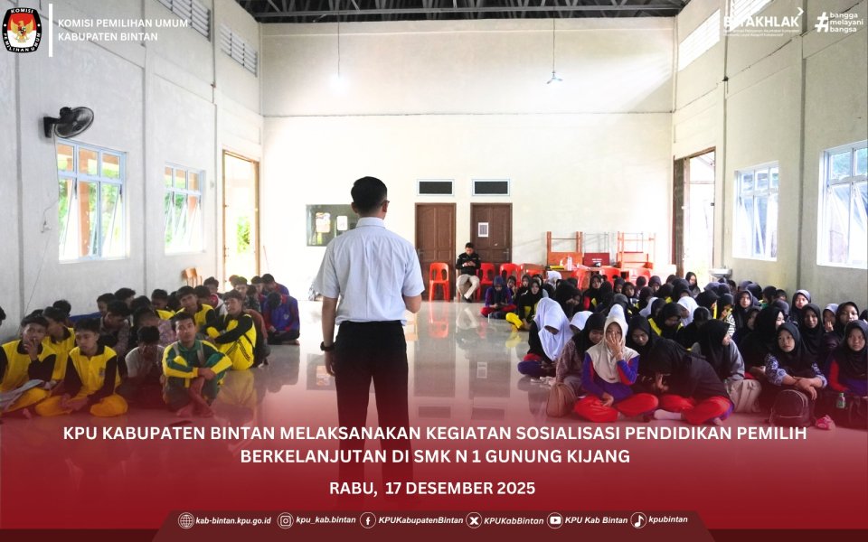 KPU Kabupaten Bintan melaksanakan Sosialisasi Pendidikan Pemilih Berkelanjutan di SMK Negeri 1 Gunung Kijang, Rabu (17/12/2025). Kegiatan yang berlangsung di aula sekolah tersebut disampaikan oleh Anggota KPU Kabupaten Bintan, Helianto, S.Pd. Dalam sosialisasi itu, Helianto memberikan edukasi kepemiluan kepada para siswa dengan menekankan pentingnya partisipasi dalam pemilu sejak usia dini. Menurutnya, pemahaman yang baik tentang demokrasi akan membentuk generasi muda menjadi pemilih yang cerdas, kritis, dan bertanggung jawab. Materi disampaikan secara komunikatif dan interaktif, mencakup pengenalan proses demokrasi, peran pemilih, serta pentingnya menjaga integritas dalam setiap tahapan pemilu. Sebagai bentuk apresiasi atas antusiasme peserta, KPU Kabupaten Bintan juga menggelar sesi tanya jawab berhadiah yang disambut dengan semangat oleh para siswa. Kegiatan ini merupakan bagian dari upaya KPU Kabupaten Bintan dalam menumbuhkan kesadaran demokrasi sejak dini guna menciptakan pemilih masa depan yang berintegritas. ....