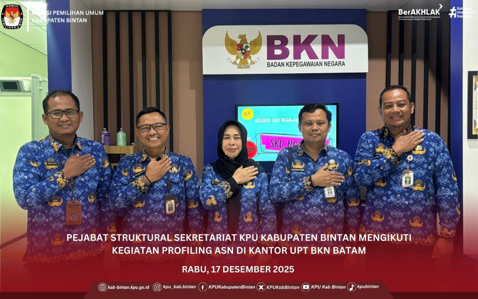KPU Kabupaten Bintan melaksanakan kegiatan pemetaan potensi dan kompetensi Aparatur Sipil Negara (ASN) KPU se-Provinsi Kepulauan Riau sebagai bagian dari persiapan pelaksanaan Profiling ASN yang akan diselenggarakan oleh Badan Kepegawaian Negara (BKN) Republik Indonesia. (Rabu, 17 Desember 2025) Kegiatan ini bertujuan untuk memperoleh gambaran menyeluruh mengenai kapasitas, potensi, serta kompetensi ASN guna mendukung pengembangan sumber daya manusia yang profesional, berintegritas, dan berdaya saing di lingkungan KPU. Dalam pelaksanaannya, kegiatan tersebut dilaksanakan oleh Sekretaris KPU Kabupaten Bintan bersama para Kepala Subbagian dari masing-masing divisi pada jajaran Sekretariat KPU Kabupaten Bintan. Pemetaan ini diharapkan dapat menjadi dasar yang objektif dan komprehensif dalam pelaksanaan Profiling ASN oleh BKN RI, sekaligus mendukung penempatan dan pengembangan ASN yang tepat sesuai dengan kompetensi dan kebutuhan organisasi, khususnya di lingkungan KPU Provinsi Kepulauan Riau. ....