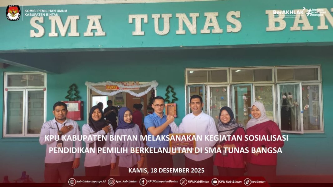 KPU Kabupaten Bintan melaksanakan Sosialisasi Pendidikan Pemilih Berkelanjutan di SMA Tunas Bangsa pada Kamis (18/12/2025). Kegiatan yang berlangsung di aula sekolah tersebut disampaikan oleh Ketua Divisi Sosialisasi, Pendidikan Pemilih, Partisipasi Masyarakat, dan SDM KPU Kabupaten Bintan, Bapak Helianto, S.Pd. Dalam kegiatan sosialisasi tersebut, Bapak Helianto memberikan edukasi kepemiluan kepada para siswa dengan menekankan pentingnya partisipasi dalam pemilu sejak usia dini. Menurutnya, pemahaman yang baik tentang demokrasi akan membentuk generasi muda menjadi pemilih yang cerdas, kritis, dan bertanggung jawab. Materi disampaikan secara komunikatif dan interaktif, meliputi pengenalan proses demokrasi, peran pemilih, serta pentingnya menjaga integritas dalam setiap tahapan pemilu. Sebagai bentuk apresiasi atas antusiasme peserta, KPU Kabupaten Bintan juga menggelar sesi tanya jawab berhadiah yang disambut dengan semangat oleh para siswa. Kegiatan ini merupakan bagian dari upaya berkelanjutan KPU Kabupaten Bintan dalam menumbuhkan kesadaran demokrasi sejak dini guna menciptakan pemilih masa depan yang berintegritas. ....