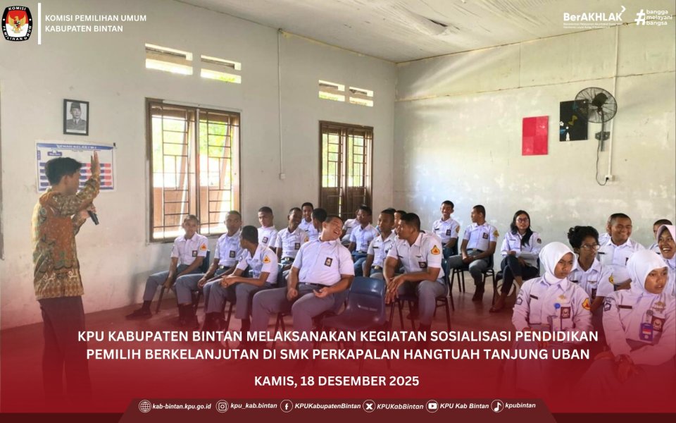KPU Kabupaten Bintan menggelar Sosialisasi Pendidikan Pemilih Berkelanjutan di SMK Perkapalan Hangtuah Tanjunguban pada Kamis (18/12/2025). Kegiatan yang berlangsung di aula sekolah ini dipandu oleh Bapak A. Fauzi, M.A., Ketua Divisi Perencanaan Data dan Informasi KPU Kabupaten Bintan. Dalam sosialisasi tersebut, Bapak A. Fauzi memberikan edukasi kepemiluan kepada siswa dengan menekankan pentingnya partisipasi aktif dalam pemilu sejak usia dini. Menurut beliau, pemahaman yang baik tentang demokrasi akan membentuk generasi muda menjadi pemilih yang cerdas, kritis, dan bertanggung jawab. Materi disampaikan dengan cara komunikatif dan interaktif, mencakup pengenalan proses demokrasi, peran pemilih, serta pentingnya menjaga integritas dalam setiap tahapan pemilu. Untuk menambah antusiasme peserta, KPU Kabupaten Bintan juga mengadakan sesi tanya jawab berhadiah, yang disambut hangat oleh para siswa. Kegiatan ini merupakan bagian dari upaya berkelanjutan KPU Kabupaten Bintan dalam menumbuhkan kesadaran demokrasi sejak dini, sekaligus membentuk pemilih masa depan yang berintegritas. ....