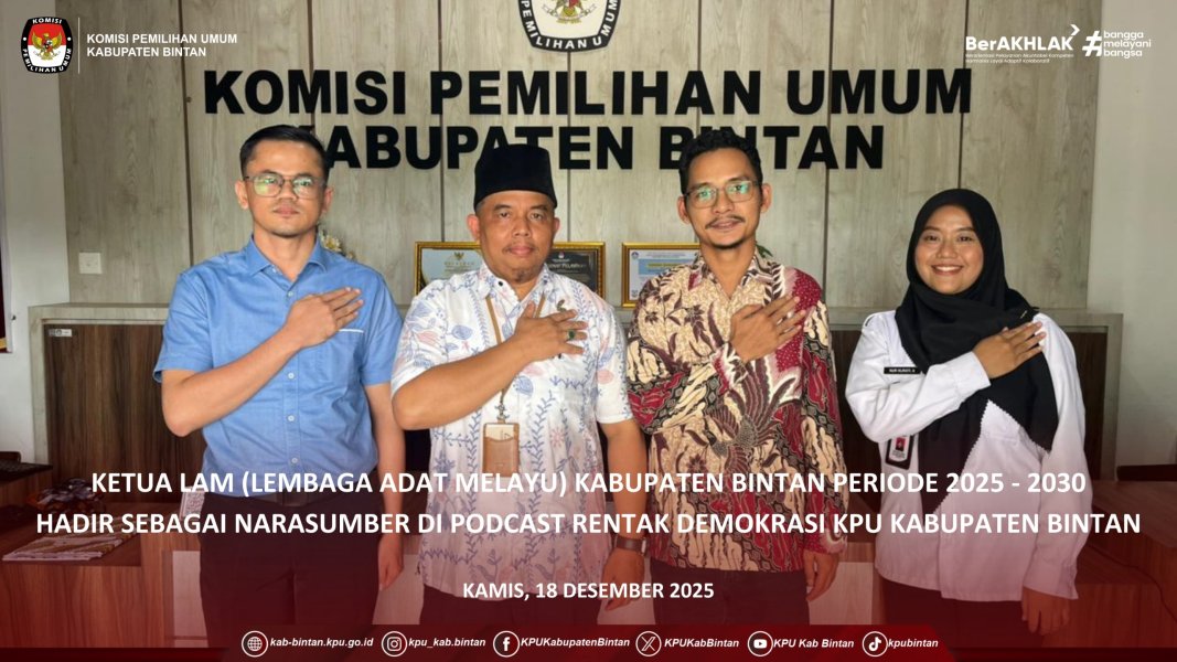 KPU Kabupaten Bintan menghadirkan episode terbaru Podcast Rentak Demokrasi pada Kamis (18/12/2025) dengan menghadirkan Ketua Lembaga Adat Melayu Kabupaten Bintan sebagai narasumber. Episode ini membahas kontribusi Lembaga Adat Melayu Kabupaten Bintan dalam mendukung dan memperkuat proses kepemiluan. Saksikan selengkapnya di YouTube Podcast Rentak Demokrasi KPU Kabupaten Bintan. Semoga tayangan ini dapat menambah literasi kepemiluan serta mendorong partisipasi masyarakat dalam berdemokrasi. ....