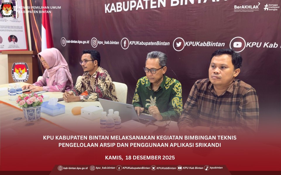 Dalam rangka mendukung tertib administrasi dan transformasi digital kearsipan, KPU Kabupaten Bintan menyelenggarakan Bimbingan Teknis Pengelolaan Arsip dan Penggunaan Aplikasi SRIKANDI pada 18 Desember 2025 di lingkungan KPU Kabupaten Bintan. Kegiatan ini dihadiri oleh Ketua dan Anggota KPU Kabupaten Bintan, Sekretaris, dan para Kepala Subbagian, serta seluruh jajaran sekretariat KPU Kabupaten Bintan. Bimtek menghadirkan Bapak Yuwono, S.S.T. Ars, Arsiparis Dinas Perpustakaan dan Arsip Daerah Kabupaten Bintan, sebagai narasumber yang memberikan pemahaman teknis mengenai pengelolaan arsip dinamis serta implementasi Aplikasi SRIKANDI dalam mendukung akuntabilitas dan efisiensi kerja organisasi. Melalui kegiatan ini, KPU Kabupaten Bintan diharapkan mampu mengelola arsip secara sistematis, aman, dan sesuai dengan ketentuan peraturan perundang-undangan. ....