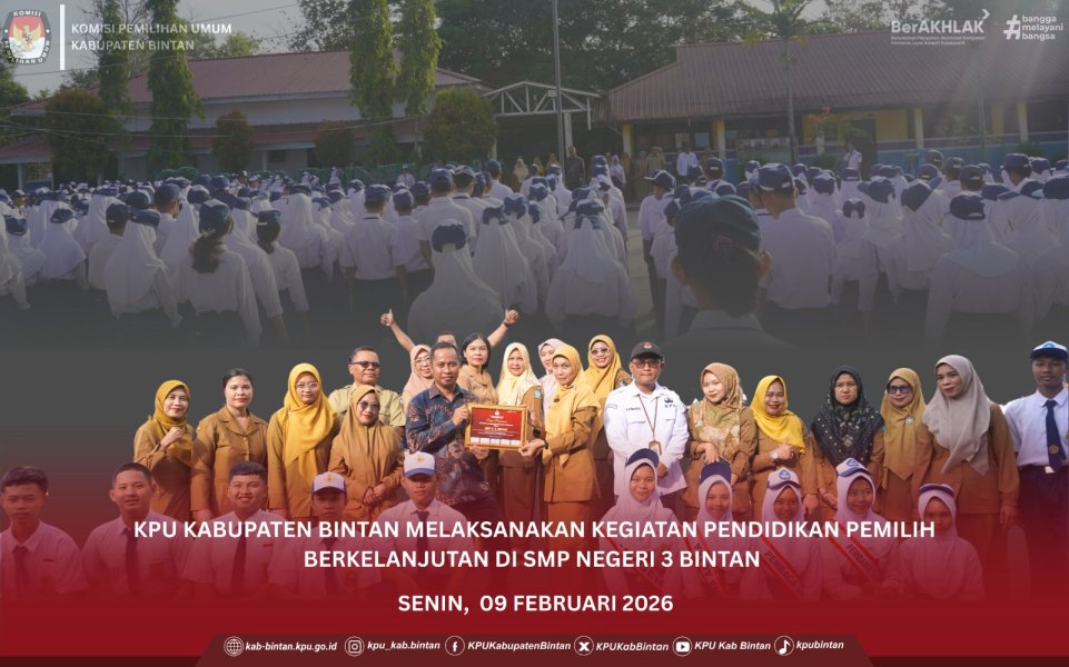 KPU Kabupaten Bintan melaksanakan kegiatan pendidikan pra-pemilih di SMP Negeri 3 Bintan pada Senin, 9 Februari 2026, pukul 07.30 WIB. Kegiatan tersebut dirangkaikan dengan upacara bendera yang diikuti oleh seluruh siswa, guru, dan tenaga kependidikan. Anggota KPU Kabupaten Bintan, Bapak Syamsul, S.Sos, bertindak selaku pembina upacara. Dalam amanatnya, beliau menyampaikan pentingnya pendidikan demokrasi sejak dini sebagai upaya membentuk generasi muda yang sadar akan hak dan kewajiban sebagai warga negara. Ia juga menekankan bahwa demokrasi tidak hanya diwujudkan melalui pemilihan umum, tetapi juga melalui sikap disiplin, kejujuran, toleransi, dan partisipasi aktif dalam kehidupan sehari-hari. Kegiatan pendidikan pra-pemilih ini bertujuan untuk memberikan pemahaman awal kepada para siswa mengenai nilai-nilai demokrasi, proses kepemiluan, serta pentingnya peran pemilih pemula dalam menjaga kualitas demokrasi di Indonesia. Melalui kegiatan ini, diharapkan para siswa dapat tumbuh menjadi generasi yang cerdas, kritis, dan bertanggung jawab dalam menggunakan hak pilihnya di masa yang akan datang. ....