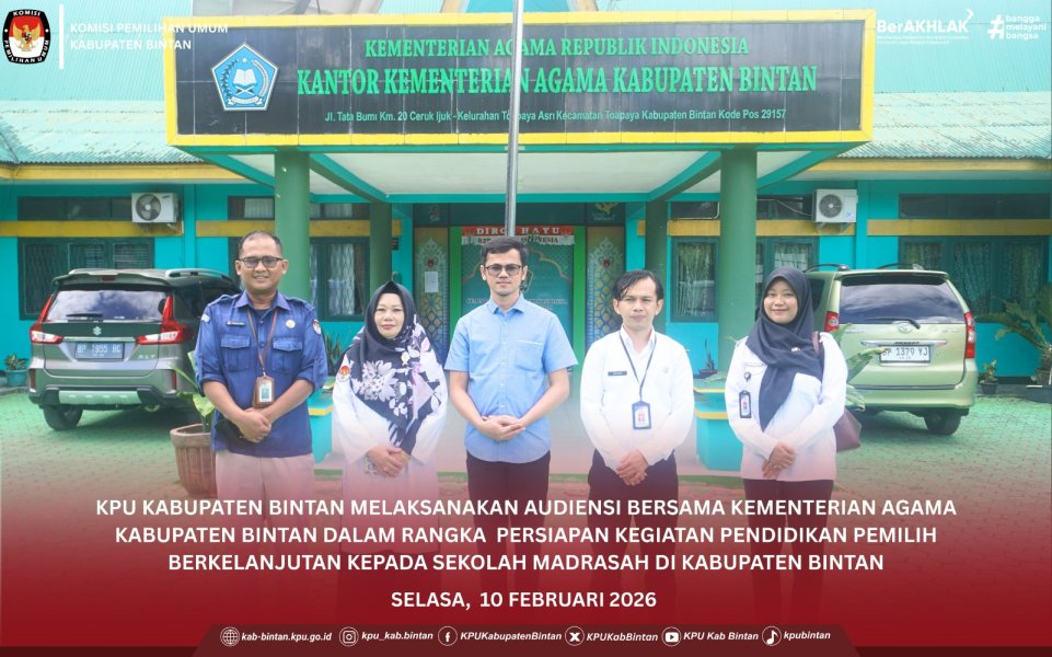 KPU Kabupaten Bintan melaksanakan audiensi ke Kantor Kementerian Agama Kabupaten Bintan pada Selasa, 10 Februari 2026, sebagai upaya memperkuat sinergi dan koordinasi antarlembaga dalam mendukung pendidikan demokrasi. Audiensi tersebut membahas peningkatan partisipasi pemilih pemula, khususnya melalui optimalisasi peran madrasah, pondok pesantren, serta satuan pendidikan di bawah naungan Kementerian Agama Kabupaten Bintan. Melalui kegiatan ini, KPU Kabupaten Bintan berharap dapat membangun kolaborasi yang berkelanjutan dengan Kementerian Agama Kabupaten Bintan dalam memberikan edukasi kepemiluan, menanamkan nilai-nilai demokrasi, serta membentuk generasi pemilih yang cerdas, berintegritas, dan bertanggung jawab. Kegiatan audiensi ini menjadi langkah strategis dalam memperluas jangkauan sosialisasi dan pendidikan pemilih, terutama bagi generasi muda sebagai pemilih masa depan. ....