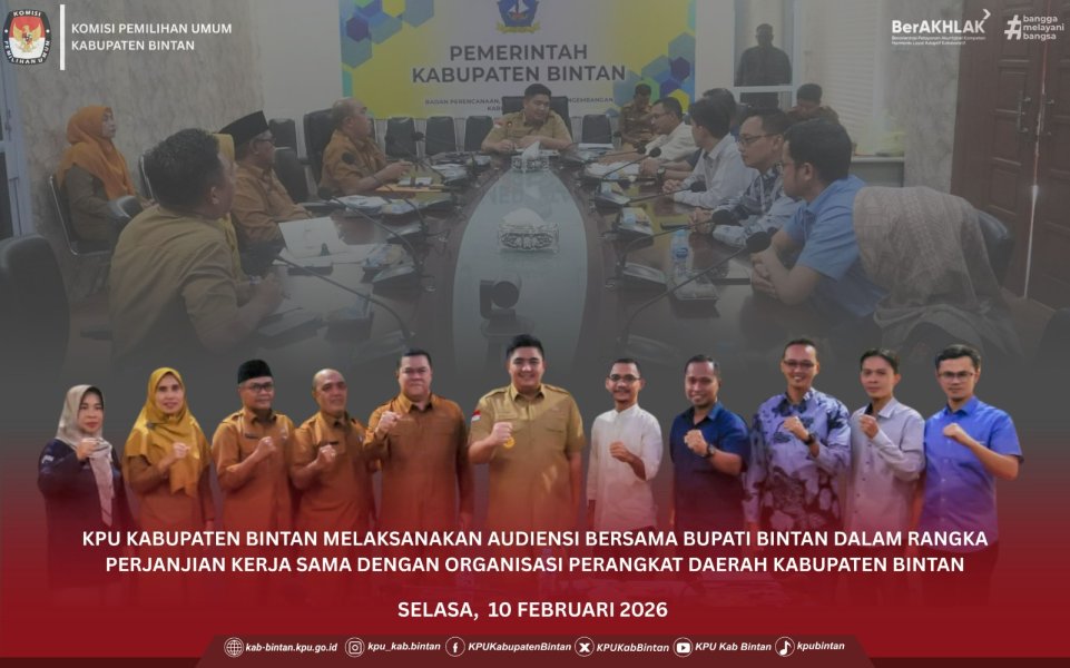 KPU Kabupaten Bintan melaksanakan audiensi bersama Bupati Bintan pada Selasa, 10 Februari 2026, dalam rangka perjanjian kerja sama dengan organisasi perangkat daerah Kabupaten Bintan. Audiensi tersebut membahas rencana kerja sama dalam rangka mendukung pelaksanaan program dan kegiatan kepemiluan, serta penguatan sinergi antarperangkat daerah guna meningkatkan kualitas layanan dan partisipasi masyarakat dalam setiap tahapan pemilihan. Kegiatan audiensi ini menjadi langkah strategis dalam memperkuat koordinasi dan kolaborasi antara KPU Kabupaten Bintan dan Pemerintah Kabupaten Bintan, sehingga pelaksanaan tugas dan fungsi KPU dapat berjalan lebih efektif, transparan, dan akuntabel. ....