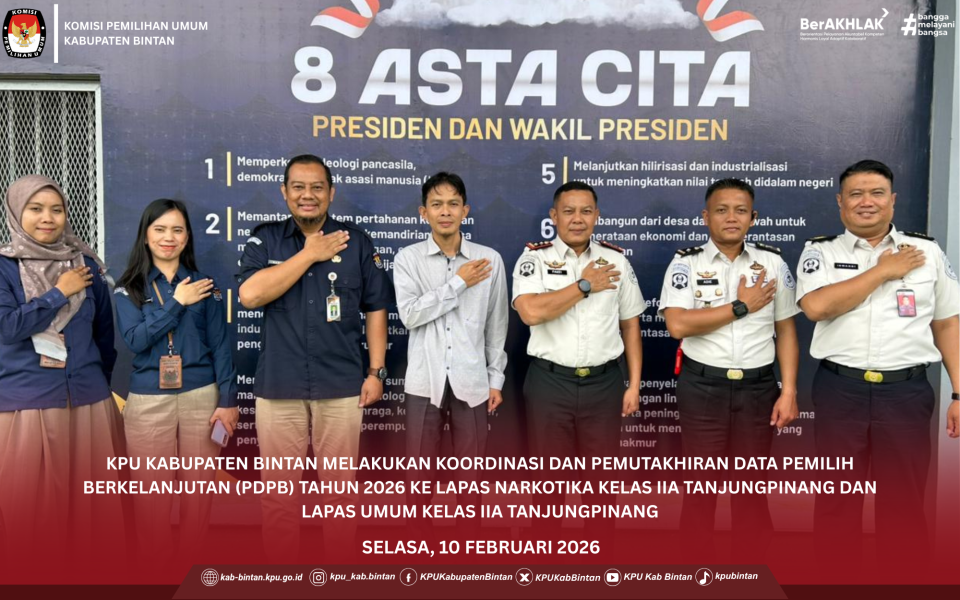 Komisi Pemilihan Umum (KPU) Kabupaten Bintan melaksanakan kegiatan koordinasi dalam rangka Pemutakhiran Data Pemilih Berkelanjutan (PDPB) Tahun 2026 pada Selasa, 10 Februari 2026. Kegiatan ini merupakan bagian dari upaya berkelanjutan KPU Kabupaten Bintan dalam menjaga akurasi dan validitas data pemilih. Koordinasi dilaksanakan dengan beberapa instansi, yakni Rumah Sakit Umum Daerah (RSUD) Kabupaten Bintan, Lembaga Pemasyarakatan Narkotika Kelas IIA Tanjungpinang, Lembaga Pemasyarakatan Umum Kelas IIA Tanjungpinang, serta Dinas Pemberdayaan Masyarakat Desa (PMD) Kabupaten Bintan. Kegiatan ini bertujuan memperkuat sinergi dan koordinasi lintas sektor dalam mendukung proses pemutakhiran data pemilih secara berkelanjutan. Melalui kolaborasi dengan instansi layanan publik dan pemasyarakatan, KPU Kabupaten Bintan berupaya memastikan bahwa data pemilih senantiasa diperbarui sesuai dengan dinamika administrasi kependudukan yang terjadi di masyarakat. Selain itu, koordinasi dengan Dinas PMD Kabupaten Bintan dilakukan untuk memperkuat tata kelola dan alur administrasi data di tingkat desa dan kelurahan, sehingga proses penyampaian dan pengelolaan data dapat berjalan lebih tertib dan terstruktur. KPU Kabupaten Bintan menyampaikan apresiasi atas dukungan dan kerja sama seluruh instansi yang telah menerima dan berpartisipasi aktif dalam kegiatan koordinasi ini. Sinergi antarinstansi diharapkan terus terjalin guna mendukung terselenggaranya pemilu dan pemilihan yang berkualitas, berintegritas, dan berlandaskan data yang akurat serta mutakhir. Sebagai bagian dari komitmen kelembagaan, KPU Kabupaten Bintan akan terus melaksanakan Pemutakhiran Data Pemilih Berkelanjutan secara periodik guna menjaga kualitas daftar pemilih dalam setiap tahapan penyelenggaraan pemilu dan pemilihan. Untuk seluruh masyarakat Kabupaten Bintan, mari bersama wujudkan demokrasi yang lebih baik di Kabupaten Bintan dengan cara berpartisipasi aktif dalam Pemutakhiran Data Pemilih Berkelanjutan (PDPB). Jangan lupa sampaikan masukan dan tanggapan anda dengan cara... [ KLIK DI SINI ]. #KPUMelayani ....