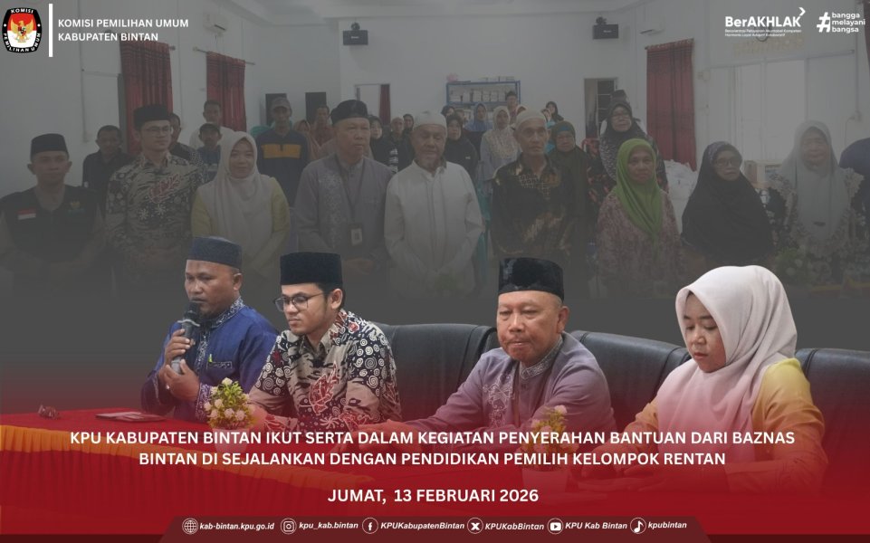 KPU Kabupaten Bintan melaksanakan kegiatan pendidikan pemilih rentan yang ikut serta dengan Badan Amil Zakat Nasional Kabupaten Bintan dalam rangka penyerahan bantuan sembako di Desa Malang Rapat, Jumat (13/2). Sebanyak 40 Kepala Keluarga (KK) menerima bantuan sembako yang disalurkan oleh BAZNAS Kabupaten Bintan. Kegiatan ini merupakan bentuk sinergi antarlembaga dalam mendukung masyarakat, khususnya kelompok rentan. Pada kesempatan tersebut, KPU Kabupaten Bintan turut menyampaikan pendidikan demokrasi kepada para penerima manfaat. Kegiatan ini bertujuan untuk meningkatkan pemahaman masyarakat mengenai pentingnya partisipasi dalam setiap tahapan pemilu serta mendorong kesadaran akan hak dan kewajiban sebagai warga negara. Melalui kolaborasi ini, KPU Kabupaten Bintan berharap edukasi demokrasi dapat menjangkau seluruh lapisan masyarakat, termasuk pemilih rentan, sehingga tercipta pemilu yang inklusif, partisipatif, dan berintegritas. ....