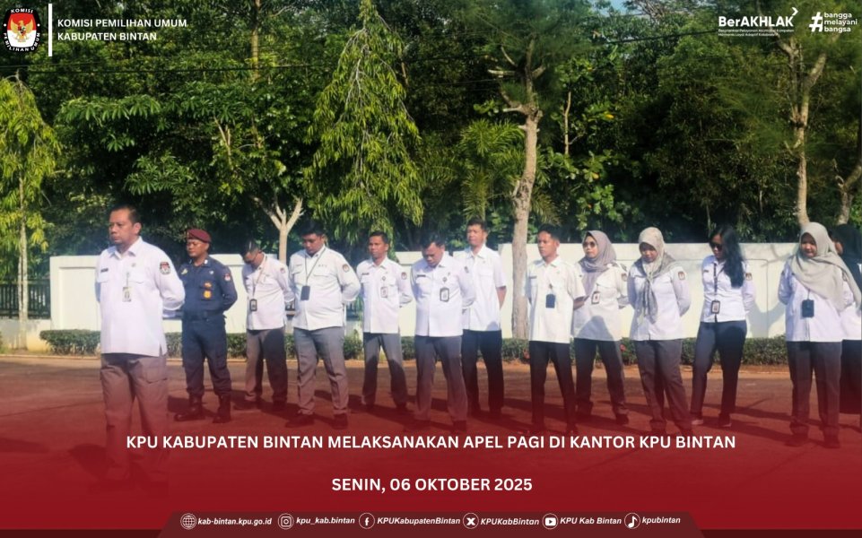 Senin, 13 Oktober 2025, KPU Kabupaten Bintan kembali melaksanakan apel pagi rutin di halaman Kantor KPU Bintan, Bapak Helianto, S.Pd. bertindak sebagai pembina apel.