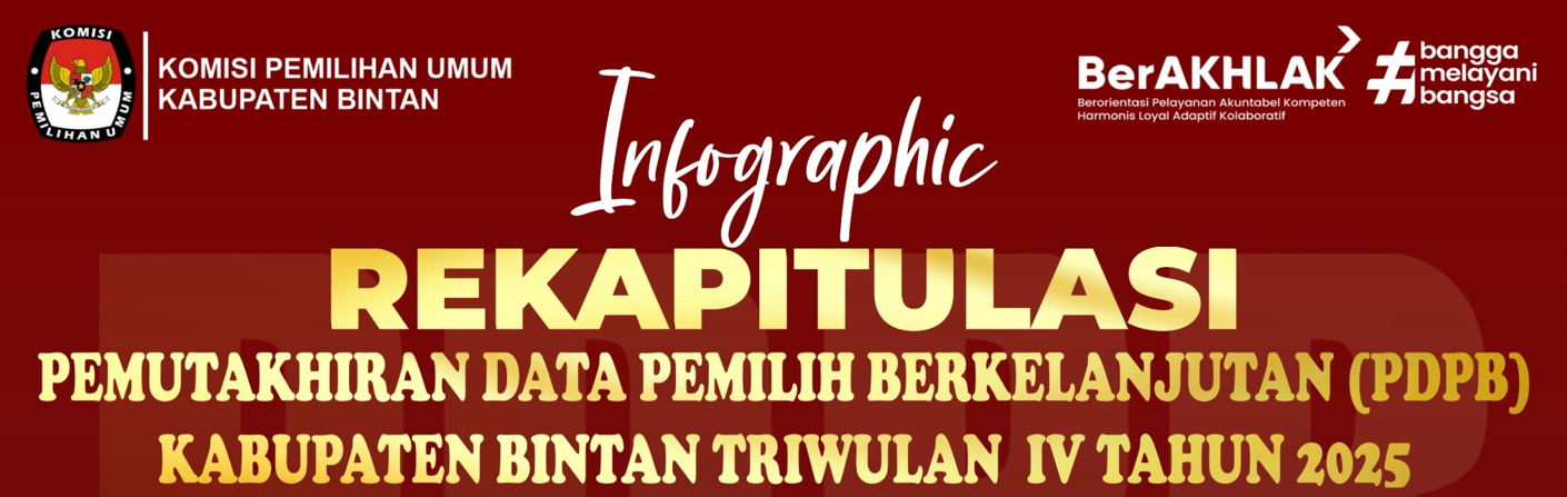 #TemanPemilih Yuk, simak infografis Rekapitulasi Pemutakhiran Data Pemilih Berkelanjutan (PDPB) Triwulan Ketiga Tahun 2025 Tingkat Kabupaten Bintan. Rekapitulasi Pemutakhiran Data Pemilih Berkelanjutan (PDPB) Berikut Rekapitulasi Pemutakhiran Data Pemilih Berkelanjutan (PDPB) Triwulan Ketiga Tahun 2025 Tingkat Kabupaten Bintan : Data terbaru kami menunjukkan: Pemilih Laki-laki : 66.077 Pemilih Perempuan : 63.242 Total Pemilih Aktif : 129.319 Perubahan data pemilih pada Triwulan Ketiga ini meliputi: • Pemilih baru: 3.505 • Pemilih tidak memenuhi syarat (TMS): 1.796 orang (karena meninggal dunia: 391 orang; ganda : 7 orang; pindah domisili: 1.396 orang; Polri: 2 orang). • Perbaikan data pemilih: 2.685 orang Rekapitulasi Jumlah Pemilih Berdasarkan Kelompok Generasi Berikut Rekapitulasi Jumlah Pemilih Berdasarkan Kelompok Generasi dalam Pemutakhiran Data Pemilih Berkelanjutan Triwulan Ketiga Tahun 2025 : Berikut Rekapitulasi Jumlah Pemilih Berdasarkan Kelompok Generasi dalam Pemutakhiran Data Pemilih Berkelanjutan Triwulan Ketiga Tahun 2025. 1. Gen Z : 35.511 2. Milenial : 43.507 3. Gen X : 36.493 4. Baby Boomer : 12.483 5. Pre Boomer : 1.325 Rekapitulasi Jumlah Pemilih Disabilitas Berikut Rekapitulasi Jumlah Pemilih Disabilitas Pemutakhiran Data Pemilih Berkelanjutan Triwulan Ketiga Tahun 2025 : Berikut Rekapitulasi Jumlah Pemilih Disabilitas Pemutakhiran Data Pemilih Berkelanjutan Triwulan Ketiga Tahun 2025. 1. Disabilitas Fisik : 357 2. Disabilitas Intelektual : 55 3. Disabilitas Mental : 101 4. Disabilitas Sensorik Wicara : 141 5. Disabilitas Sensorik Rungu : 45 6. Disabilitas Sensorik Netra : 77 Untuk seluruh masyarakat Kabupaten Bintan, mari bersama wujudkan demokrasi yang lebih baik di Kabupaten Bintan dengan cara berpartisipasi aktif dalam Pemutakhiran Data Pemilih Berkelanjutan (PDPB). Jangan lupa sampaikan masukan dan tanggapan anda dengan cara... [ KLIK DI SINI ]. #KPUMelayani