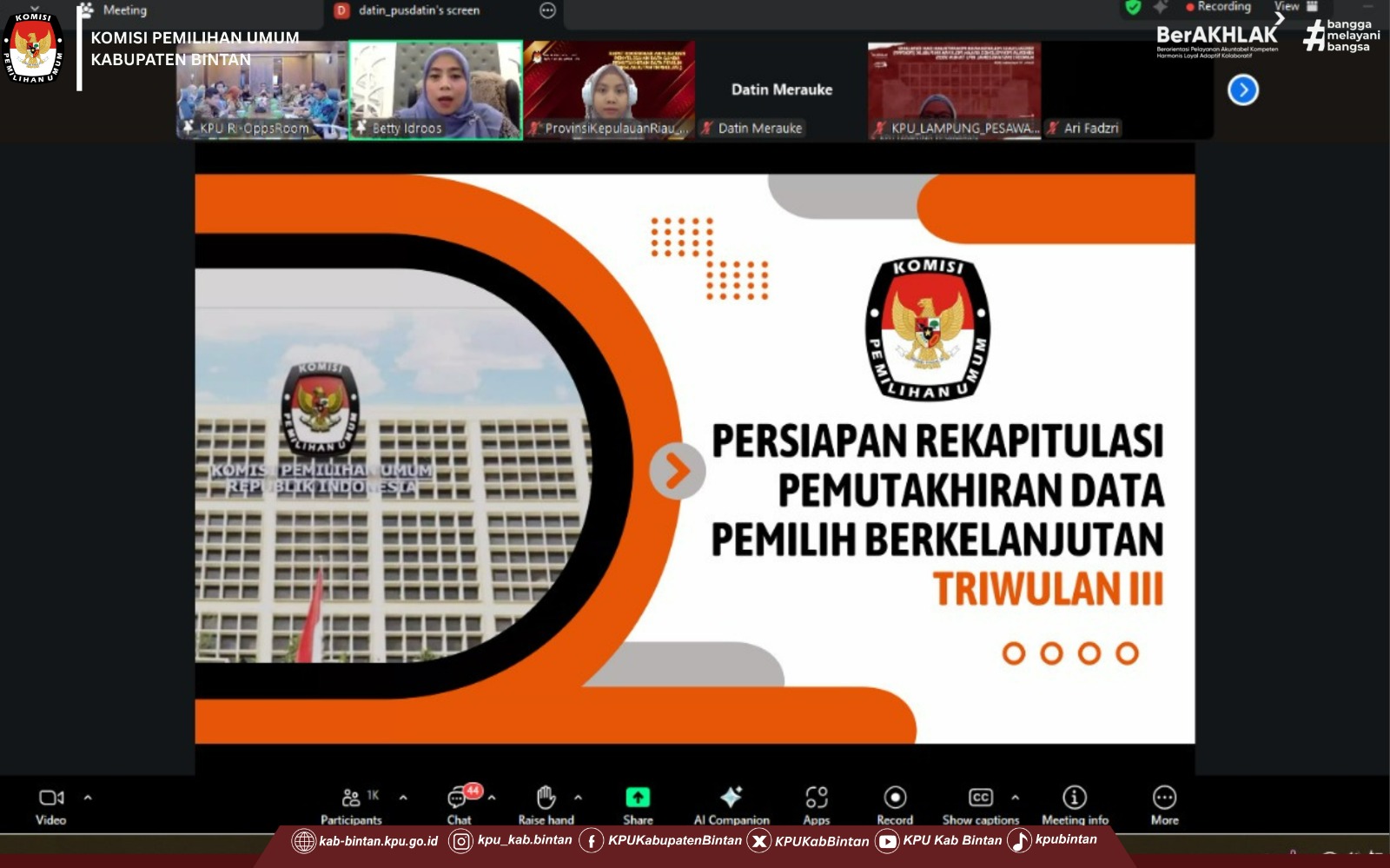 Dalam kegiatan tersebut, Ibu Betty Epsilon Idroos memberikan penjelasan terkait persiapan rekapitulasi PDPB Triwulan III yang akan segera ditetapkan. Rakor ini diikuti oleh seluruh KPU Kabupaten/Kota se-Indonesia sebagai bagian dari upaya menjaga akurasi, transparansi, dan keberlanjutan data pemilih.