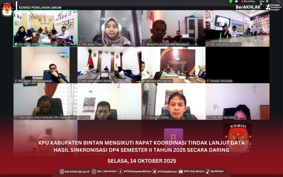 KPU Kabupaten Bintan baru saja mengikuti kegiatan Rapat Koordinasi Tindak Lanjut Data Hasil Sinkronisasi DP4 Semester II Tahun 2025 yang digelar oleh KPU Provinsi Kepulauan Riau secara daring. Rapat koordinasi tersebut dihadiri oleh KPU Kabupaten/Kota Se-Provinsi Kepulauan Riau pada hari Selasa, 14 Oktober 2025.