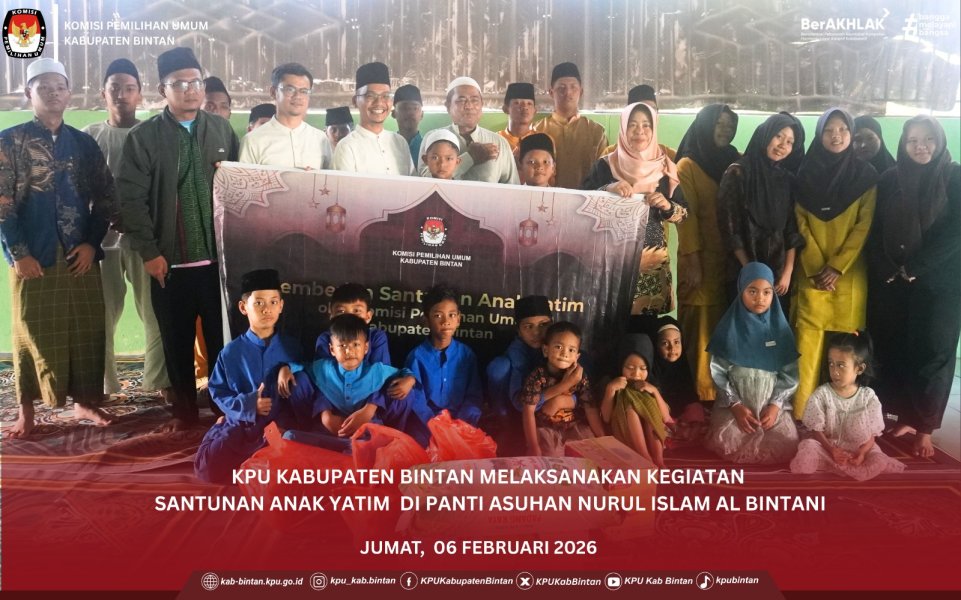 KPU Kabupaten Bintan melaksanakan kegiatan santunan kepada anak yatim di Panti Asuhan Nurul Islam Al Bintani pada Jumat, 6 Februari 2026 pukul 16.00 WIB.