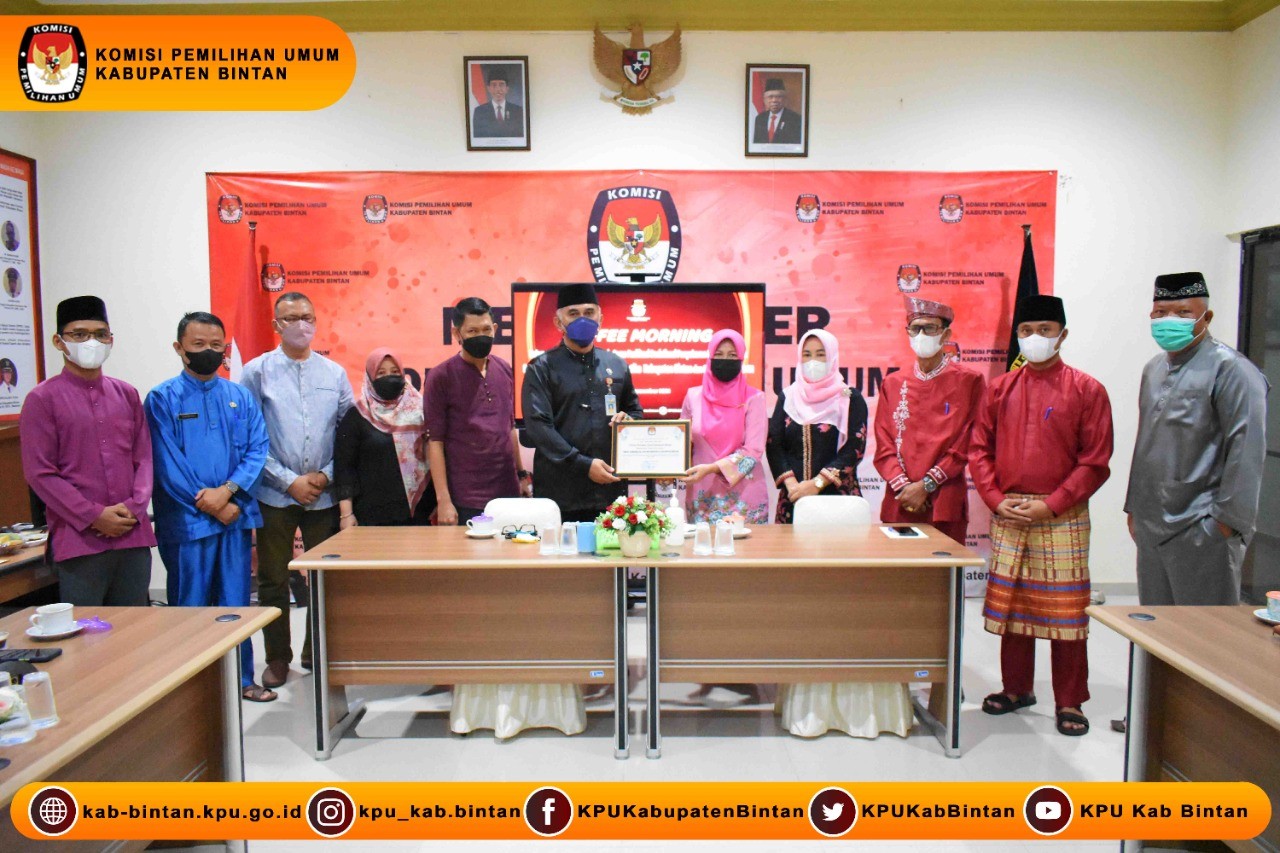 KPU Kabupaten Bintan memberikan piagam penghargaan kepada Dinas Komunikasi dan Informatika (Diskominfo) Kabupaten Bintan dan Bintan Radio 96,5 FM dalam kesempatan coffee morning di Kantor KPU Bintan, Jum'at (24/12) pagi.