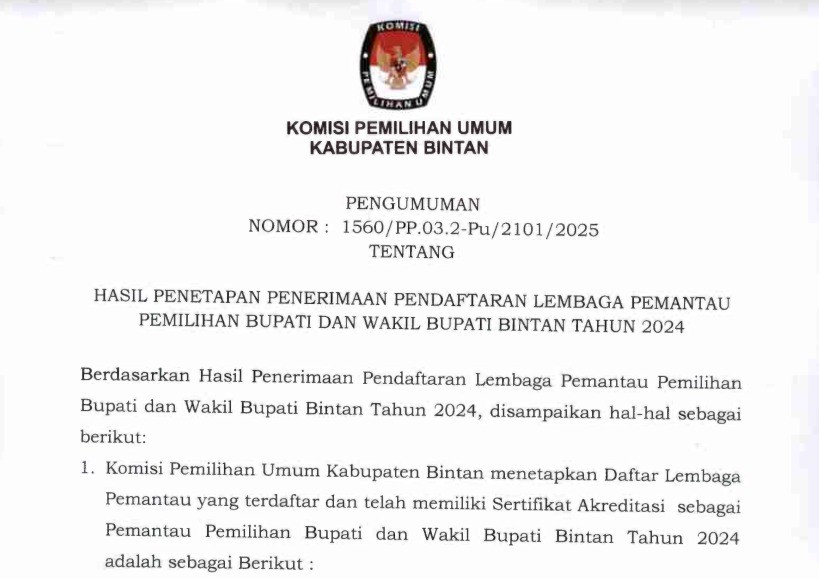 HASIL PENETAPAN PENERIMAAN PENDAFTARAN LEMBAGA PEMANTAU PEMILIHAN BUPATI DAN WAKIL BUAPTI BINTAN TAHUN 2024 Selasa, 19 November 2024 07:00 718 Selengkapnya dapat diunduh disini Bagikan: Telah dilihat 718 kali