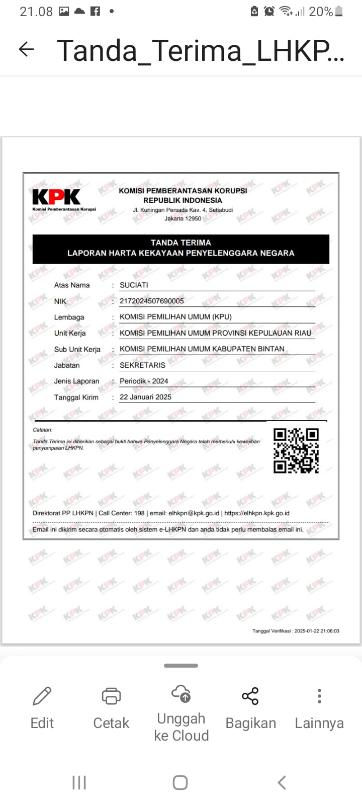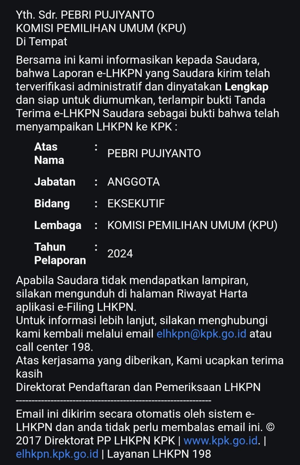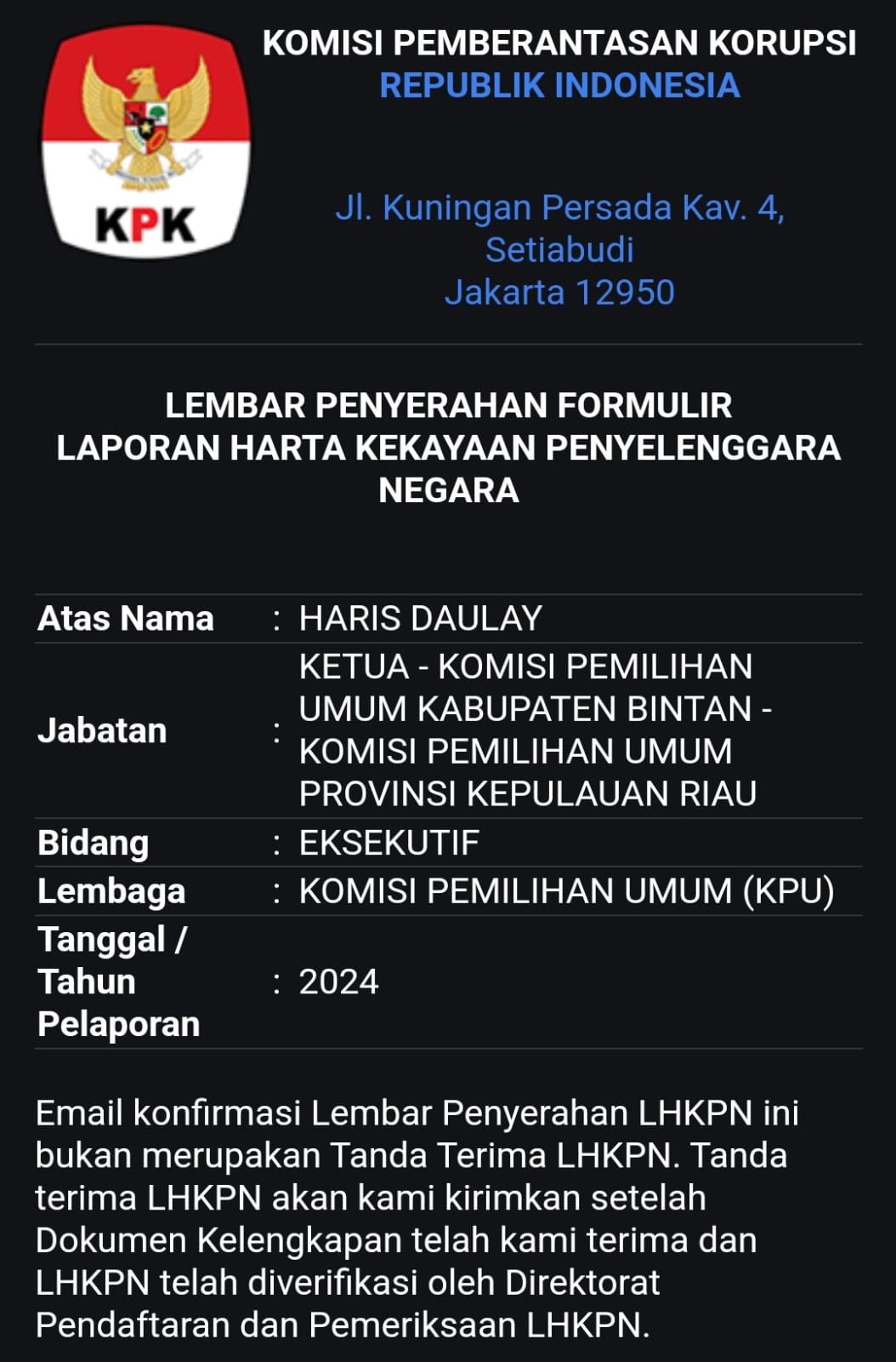 Berikut Laporan Harta Kekayaan Penyelenggara Negara KPU Kabupaten Bintan Tahun 2024