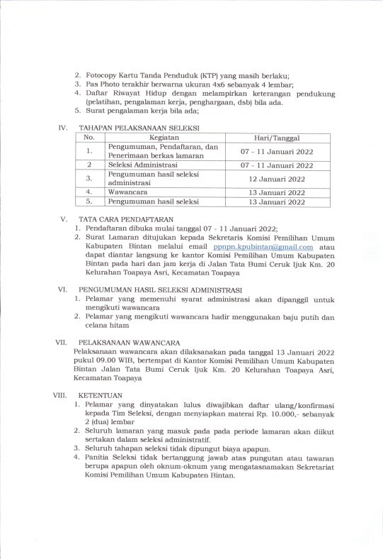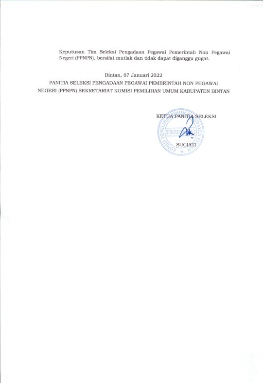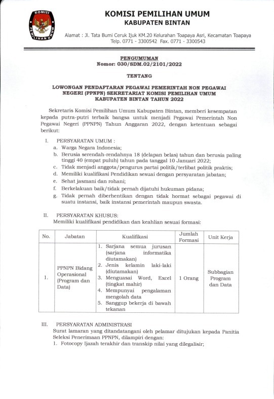 Pengumuman Komisi Pemilihan Umum Kabupaten Bintan Tentang Lowongan Pendaftaran Pegawai Pemerintah Non Pegawai Negeri (PPNPN) Sekretariat Komisi Pemilihan Umum Kabupaten Bintan Tahun 2022