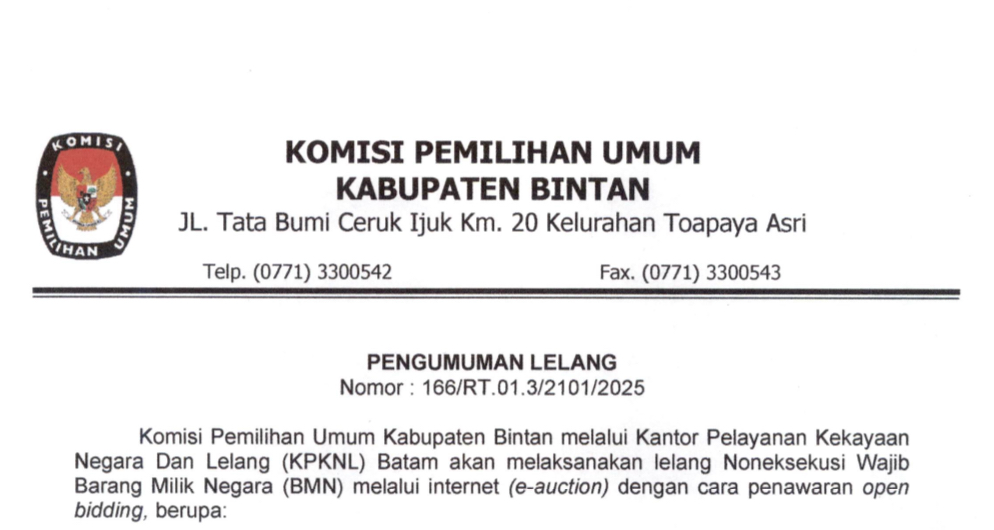 PENGUMUMAN LELANG NOMOR : 166/RT.01.3/2101/2025 Jumat, 28 Februari 2025 07:00 459 Selengkapnya dapat diunduh disini! Bagikan: Telah dilihat 459 kali