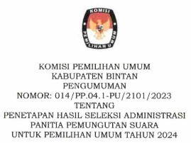 Pengumuman Nomor: 014/PP.04.1-PU/2101/2023 Tentang Penetapan Hasil Seleksi Administrasi Panitia Pemungutan Suara Untuk Pemilihan Umum Tahun 2024