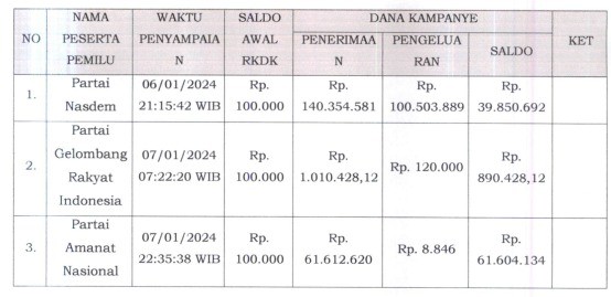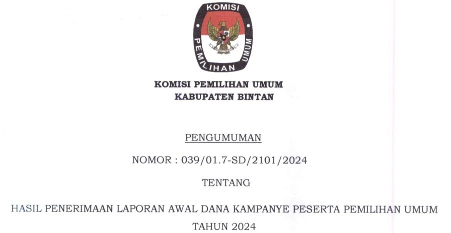 Pengumuman Nomor : 039/01.7-SD/2101/2024 Tentang Hasil Penerimaan Laporan Awal Dana Kampanye Peserta Pemilihan Umum Tahun 2024