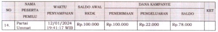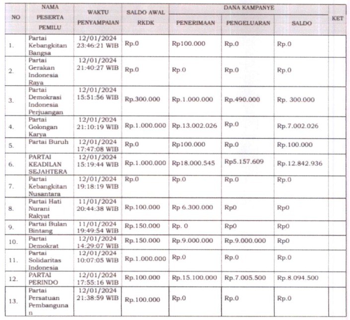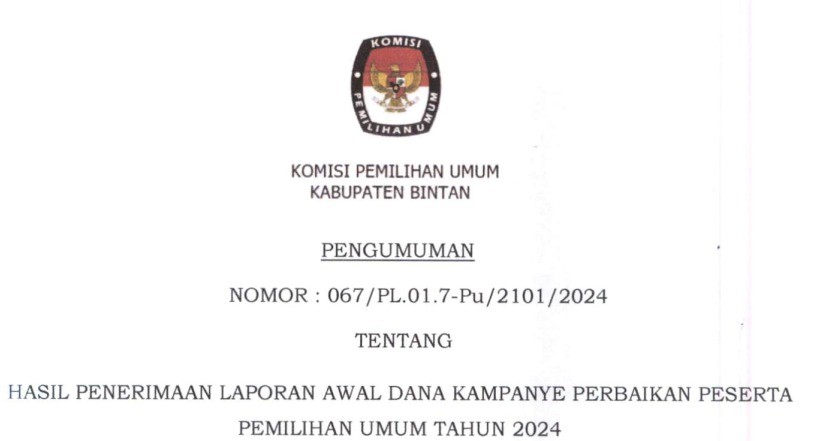 Pengumuman Nomor : 067/PL.01.7-Pu/2101/2024 Tentang Hasil Penerimaan Laporan Awal Dana Kampanye Perbaikan Peserta Pemilihan Umum Tahun 2024