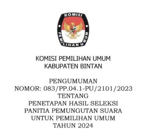 Pengumuman Nomor: 083/PP.04.1-PU/2101/2023 Tentang Penetapan hasil seleksi Panitia pemungutan suara Untuk pemilihan umum Tahun 2024