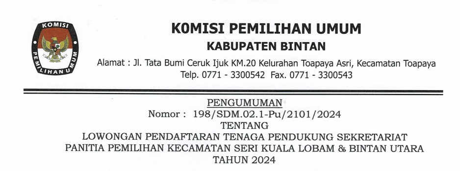 kab-bintan.kpu.go.id - Sekretaris Komisi Pemilihan Umum Kabupaten Bintan, memberi kesempatan kepada putra-putri terbaik bangsa untuk menjadi Tenaga Pendukung Sekretariat Panitia Pemilihan Kecamatan Seri Kuala Lobam dan Bintan Utara Tahun Anggaran 2024, dengan ketentuan sebagai berikut: