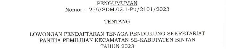kab-bintan.kpu.go.id - Sekretaris Komisi Pemilihan Umum Kabupaten Bintan, memberi kesempatan kepada putra-putri terbaik bangsa untuk menjadi Tenaga Pendukung Sekretariat Panitia Pemilihan Kecamatan se-Kabupaten Bintan Tahun Anggaran 2023, dengan ketentuan sebagai berikut: