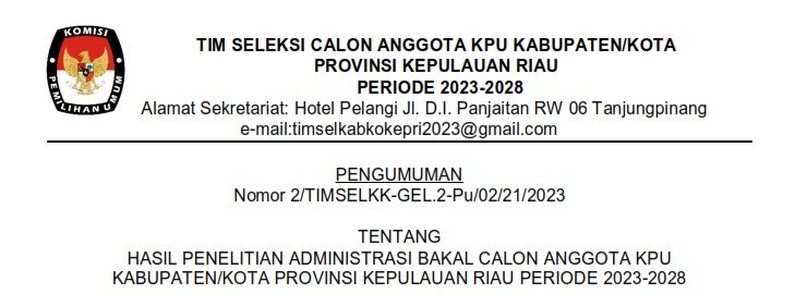 Pengumuman Nomor 2/TIMSELKK-GEL.2-Pu/02/21/2023 Tentang Hasil Penelitian Administrasi Bakal Calon Anggota Kpu Kabupaten/Kota Provinsi Kepulauan Riau Periode 2023-2028
