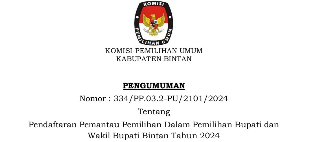 Pengumuman Nomor : 334/PP.03.2-PU/2101/2024 Tentang Pendaftaran Pemantau Pemilihan Dalam Pemilihan Bupati dan Wakil Bupati Bintan Tahun 2024
