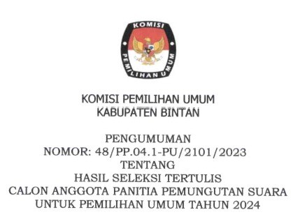 Pengumuman Nomor: 48/PP.04.1-PU/2101/2023 Tentang Hasil Seleksi Tertulis Calon Anggota Panitia Pemungutan Suara Untuk Pemilihan Umum Tahun 2024
