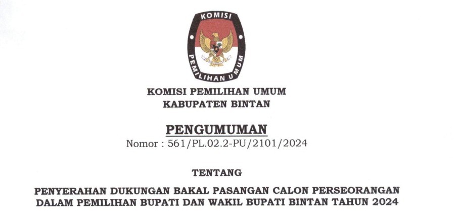 Pengumuman Nomor 561/PL.02.2-Pu/2101/2024 Tentang Penyerahan Dukungan Bakal Calon Perseorangan
