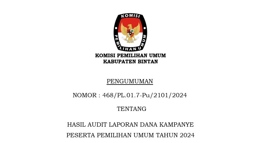 kab-bintan.kpu.go.id - Berdasarkan Laporan Hasil Audit Laporan Dana Kampanye Peserta Pemilihan Umum Tahun 2024 oleh Kantor Akuntan Publik yang telah ditunjuk oleh Komisi Pemilihan Umum Provinsi Kepulauan Riau, Disampaikan hasil audit Laporan Dana Kampanye Peserta Pemilihan Umum sebagai berikut: