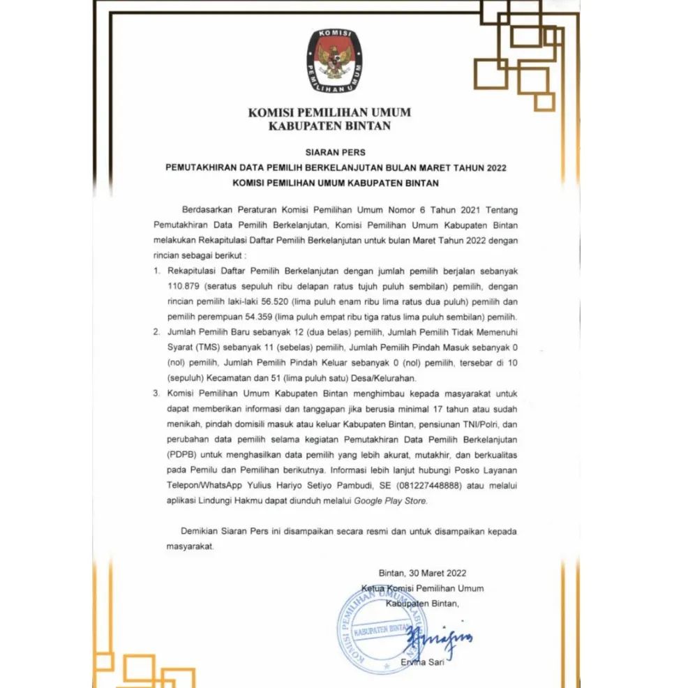 Berikut Siaran Pers Rekapitulasi Pemutakhiran Data Pemilih Berkelanjutan Periode Bulan Maret Tahun 2022 di Kabupaten Bintan.