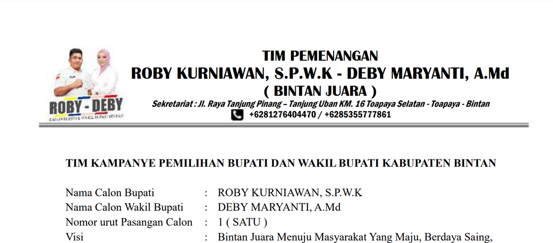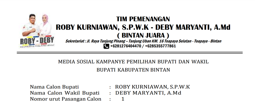 Tim Kampanye dan Akun Sosial Media Kampanye Calon Bupati dan Wakil Bupati Bintan Tahun 2024 Rabu, 25 September 2024 07:00 455 Tim Kampanye Pemilihan Bupati dan Wakil Bupati Kabupaten Bintan dapat diunduh disini Media Sosial Kampanye Pemilihan Bupati dan Wakil Bupati Kabupaten Bintan dapat diunduh disini Bagikan: Telah dilihat 455 kali
