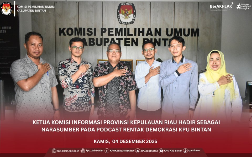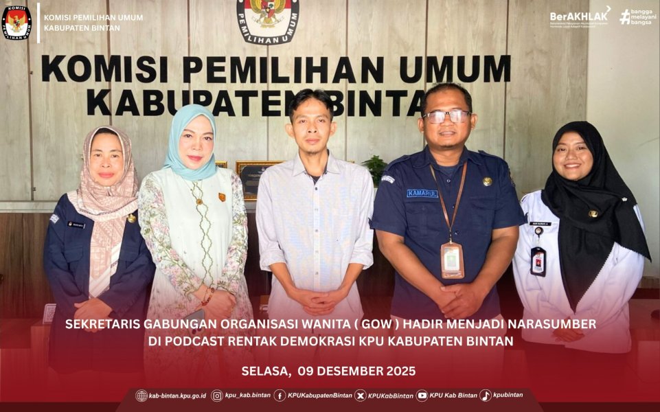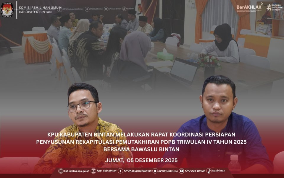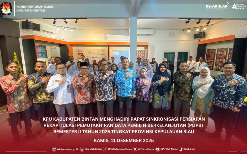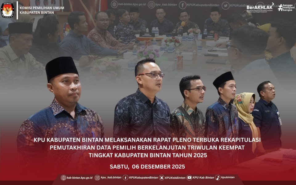 Bintan, kpu.go.id - Pada hari Sabtu, tanggal 6 Desember 2025, KPU Kabupaten Bintan telah melaksanakan Rapat Pleno Rekapitulasi Daftar Pemilih Berkelanjutan (PDPB) Triwulan Keempat Tingkat Kabupaten Bintan Tahun 2025. Rapat dilaksanakan di RPP KPU Bintan dan dipimpin langsung oleh Ketua KPU Kabupaten Bintan, serta dihadiri oleh seluruh Komisioner dan Sekretaris KPU Bintan, KPU Provinsi Kepulauan Riau, Bawaslu Kabupaten Bintan, Polres Bintan, Komandan Lanal Bintan, Kodim 0315 Tanjungpinang, Dinas Kependudukan dan Pencatatan Sipil, Kemenag Bintan, Badan Intelejen Daerah Kabupaten Bintan, Lapas Narkotika Kelas IIA Tanjungpinang, Dinas PMD Bintan, RSUD Bintan dan perwakilan partai politik tingkat kabupaten Bintan.