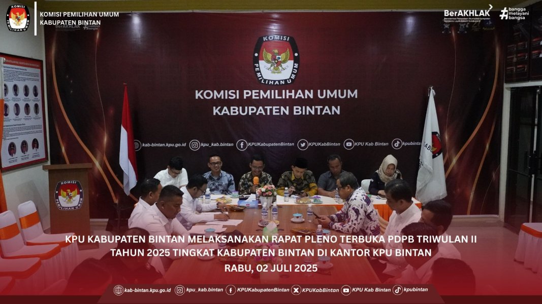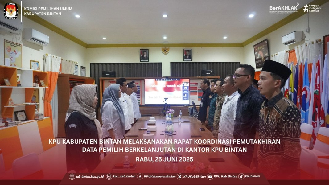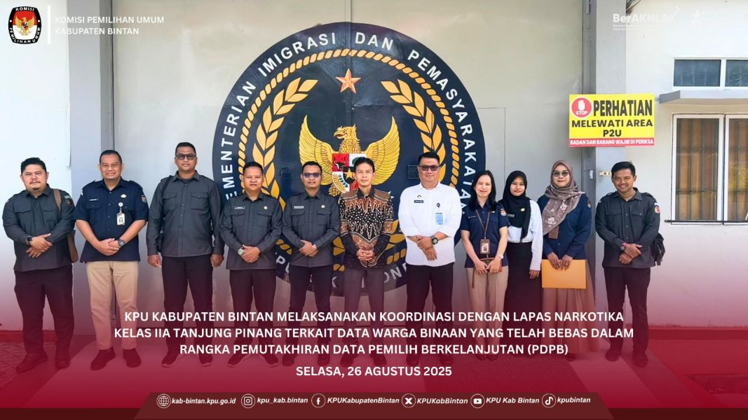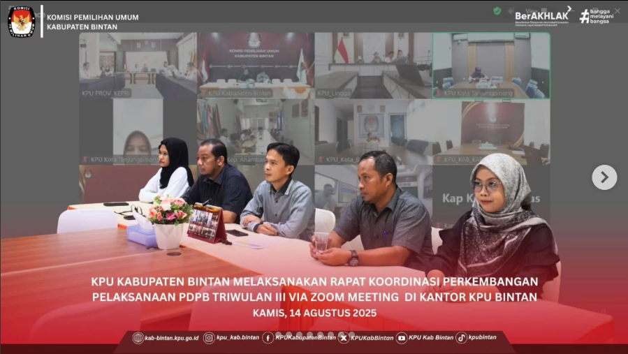 Bintan, kpu.go.id - Komisi Pemilihan Umum Kabupaten Bintan terus berupaya menjaga keakuratan data pemilih dengan mengikuti Rapat Koordinasi Perkembangan Pelaksanaan Pemutakhiran Data Pemilih Berkelanjutan (PDPB) Triwulan III tahun 2025 yang digelar oleh KPU Provinsi Kepulauan Riau. Rakor yang dilaksanakan secara virtual melalui Zoom Meeting pada Kamis, 14 Agustus 2025, ini melibatkan seluruh KPU Kabupaten/Kota se-Provinsi Kepri. Rapat ini membahas progres pelaksanaan PDPB di setiap Kab/Kota di Prov. Kepulauan Riau periode Juli - September (Triwulan III), serta solusi terhadap setiap kendala yang dihadapi. Rapat ini juga menyepakati bahwa KPU Kab/Kota akan melaksanakan Coktas (Coklit Terbatas) di periode ini pada bulan Agustus & September, dan penguatan koordinasi antara KPU Kab/Kota dengan instansi-instansi yang berkaitan dengan kependudukan. Hal ini bertujuan untuk memvalidasi kembali data pemilih yang ada agar lebih akurat dan mutakhir. Selain itu, rakor ini juga menekankan pentingnya penguatan koordinasi antara KPU Kabupaten/Kota dengan instansi terkait kependudukan, seperti Dinas Kependudukan dan Catatan Sipil (Disdukcapil). Kolaborasi ini diharapkan dapat memastikan data pemilih yang digunakan untuk pemilu mendatang benar-benar valid dan akuntabel. Kegiatan ini menjadi bukti nyata komitmen KPU Kabupaten Bintan dalam mewujudkan daftar pemilih yang akurat, mutakhir, dan komprehensif. Upaya ini merupakan langkah strategis dalam mempersiapkan Pemilu Kedepan yang lebih berkualitas dan terpercaya.