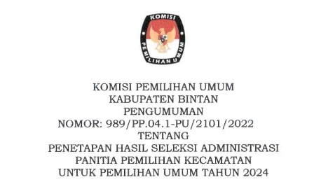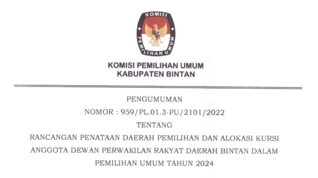 kab-bintan.kpu.go.id - Dalam rangka melaksanakan ketentuan pasal (16) Peraturan KPU Nomor 6 Tahun 2022 tentang Penataan Daerah Pemilihan dan Alokasi Kursi Anggota Dewan Perwakilan Rakyat Daerah Kabupaten/Kota dalam Pemilihan Umum Tahun 2024, dan berdasarkan Berita Acara Pleno Nomor : 88/PK.01/02/2102/2022 tentang Penyusunan Rancangan Penataan Daerah Pemilihan (DAPIL) dan Alokasi Kursi Anggota DPRD Kabupaten Karimun Pemilihan Umum Tahun 2024, bersama ini diumumkan kepada masyarakat terkait Rancangan Penataan Daerah Pemilihan dan Alokasi Kursi Anggota DPRD Kabupaten Karimun dalam Pemilihan Umum Tahun 2024. KPU Kabupaten Karimun juga menerima masukan dan tanggapan masyarakat atas rancangan Dapil dimaksud. Untuk informasi selengkapnya, silahkan kunjungi tautan di bawah ini.