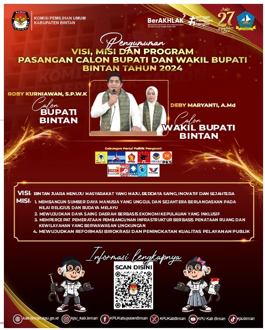 Bahwa untuk melaksanakan ketentuan Pasal 137 Peraturan KPU Nomor 8 Tahun 2024 tentang Pencalonan Gubernur dan Wakil Gubernur, Bupati dan Wakil Bupati, serta Walikota dan Wakil Walikota yang telah diubah dengan Peraturan KPU Nomor 10 Tahun 2024 tentang Perubahan Atas Peraturan KPU Nomor 8 Tahun 2024 tentang Pencalonan Gubernur dan Wakil Gubernur, Bupati dan Wakil Bupati, serta Walikota dan Wakil Walikota, Komisi Pemilihan Umum Kabupaten Bintan mengumumkan Penerimaan Masukan dan Tanggapan Masyarakat terhadap Pasangan Calon Bupati dan Wakil Bupati Kabupaten Bintan sebagai berikut: