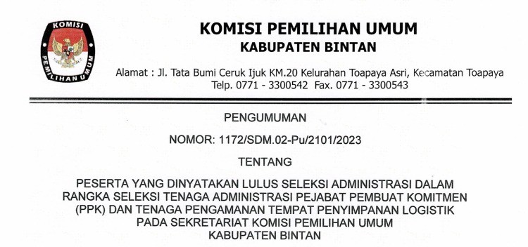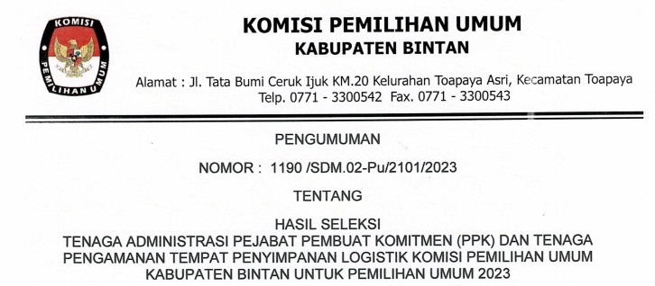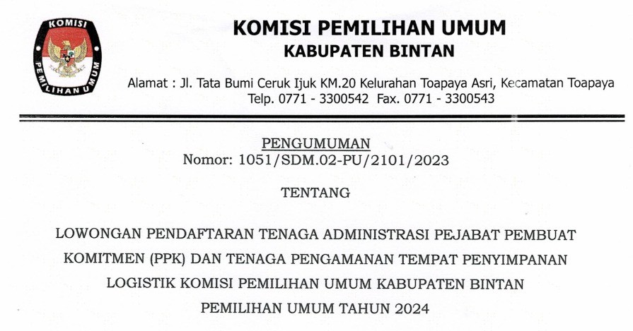 kab-bintan.kpu.go.id - Komisi Pemilihan Umum Kabupaten Bintan memberi kesempatan kepada putra-putri terbaik bangsa untuk menjadi Tenaga Administrasi Pejabat Pembuat Komitmen (PPK) dan Tenaga Pengamanan Tempat Penyimpanan Logistik Pemilihan Umum Tahun 2024, dengan ketentuan sebagai berikut: